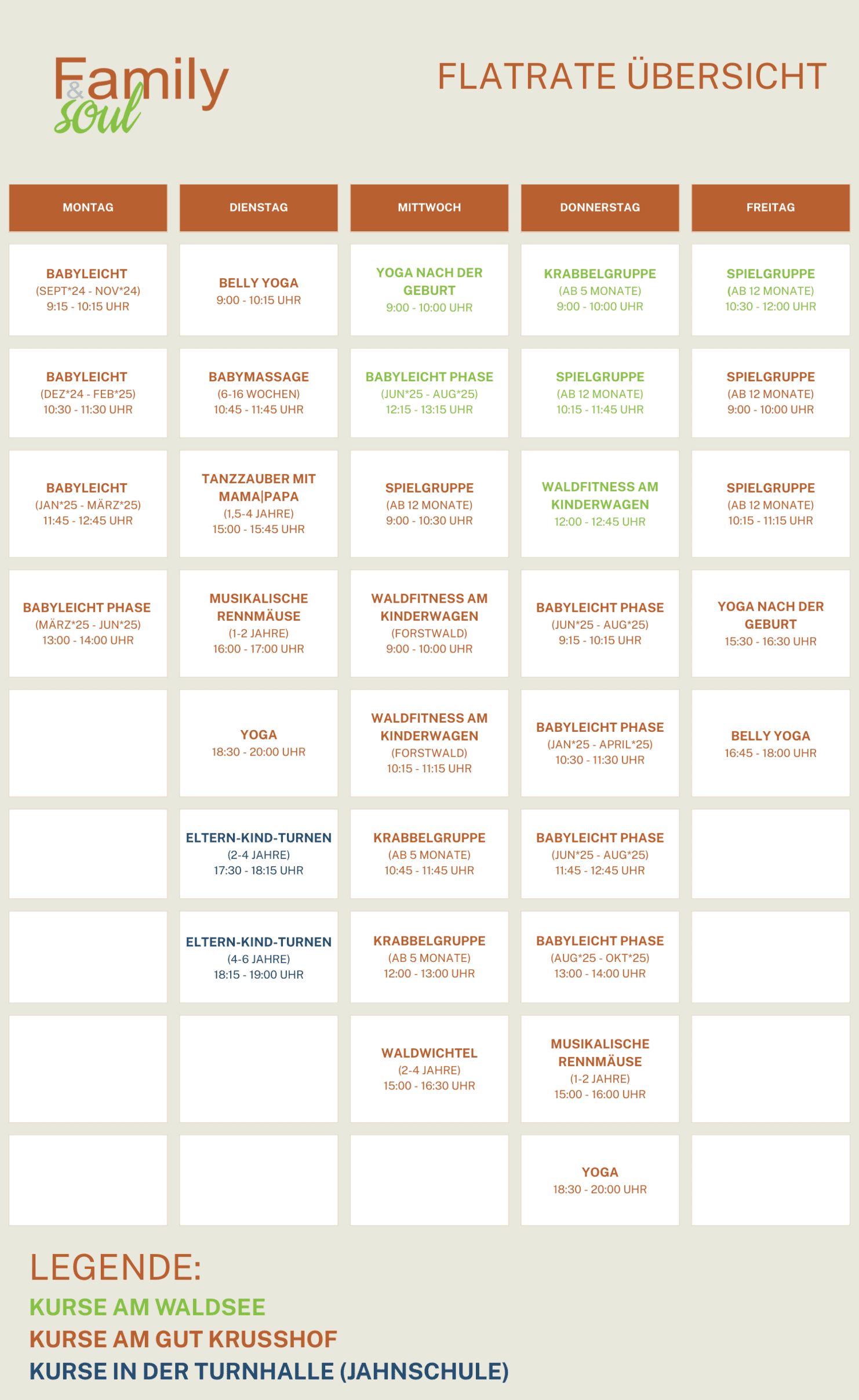 Unsere Family & Soul-Flatrate ermöglicht es euch, unser Kursangebot unbegrenzt und flexibel nutzen zu können. Dabei könnt ihr nicht nur aus einem großen Angebot am Gut Krusshof wählen, sondern auch eine Vielzahl an Kinder- und Babykursen vom Uerdinger Schwimmverein 08 nutzen, wie unsere Krabbelgruppen, Turnhallenangebote und das Family & Soul-Café (ausgenommen Babyschwimmen).