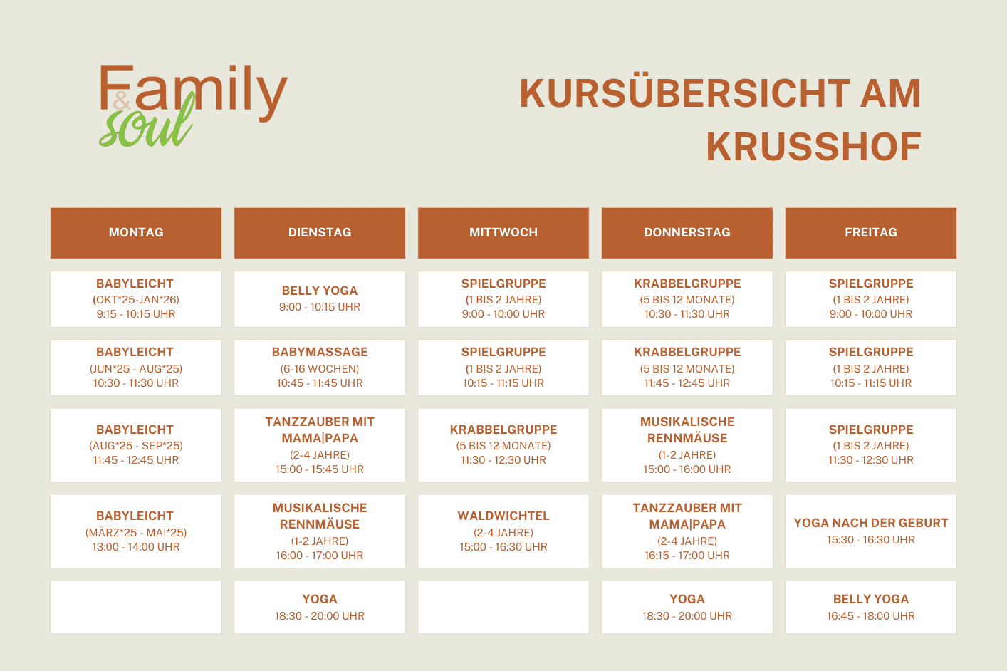 Bei freien Kapazitäten ist eine Probestunde jederzeit möglich. Bitte über info@familyandsoul.de anfragen.