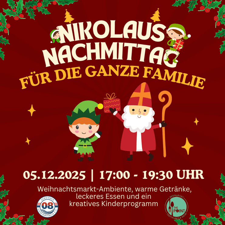 Ein kleines Weihnachtsmarkt-Ambiente, warme Getränke, leckeres Essen und ein kreatives Kinderprogramm sorgen für festliche Stimmung und gemeinsames Erleben. Abgerundet wird der Tag mit dem Besuch vom Nikolaus himself, der für jedes angemeldete Kind eine Kleinigkeit dabei hat.