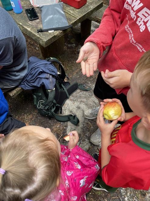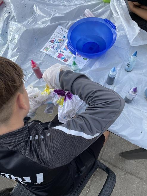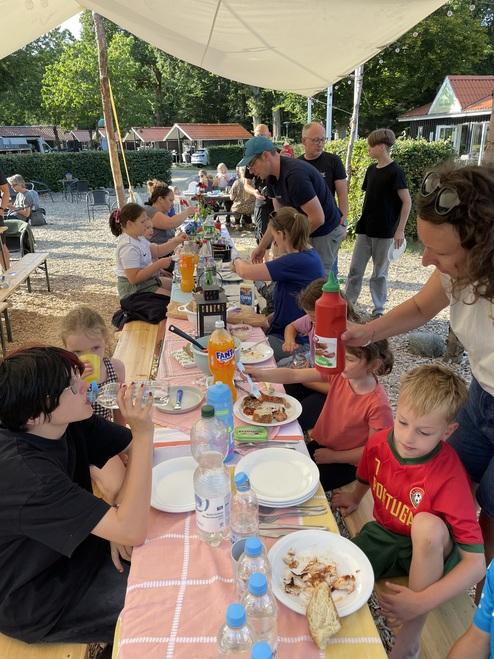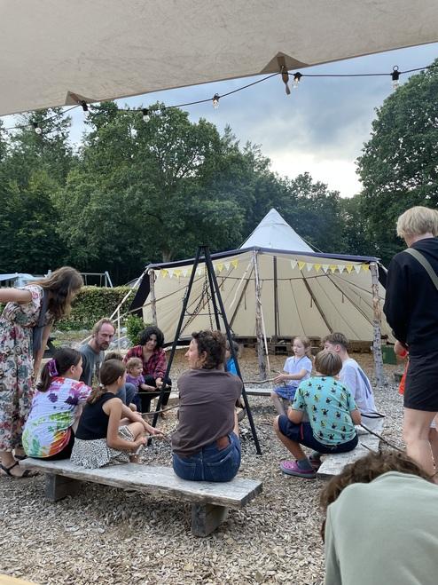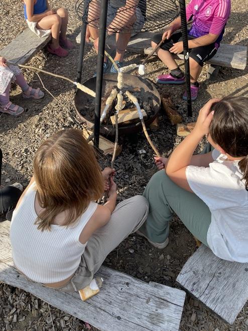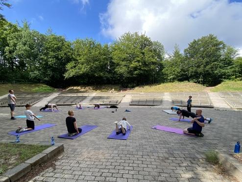 Die darauffolgenden Tage waren geprägt von einem bunt gemischten Programm, welches vor allem an der frischen Luft stattfand und von allen Teilnehmer*innen stets mit Vorfreude und Neugier angenommen wurde. Alle zwei Tage trafen sich die Erwachsenen (und nach und nach auch immer mal ein paar der Kinder) zum morgendlichen Sportprogramm, welches aus einer Mischung aus Übungen mit dem eigenen Körpergewicht und Elementen des Functional Fitness bestand und die Teilnehmer*innen doch gut zum Schwitzen brachte. Ganz kreativ ging es gleichzeitig bei den Kindern hinzu – ob beim Holz schnitzen, T-Shirts batiken oder Traumfänger und Armbänder basteln oder der Vorbereitung des abendlichen Stockbrots am Lagerfeuer. Natürlich wurde auch viel gespielt und getobt – vor allem auf dem heißbegehrten Hüpfkissen des Campingplatzes.