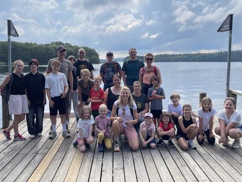 Das Wetter war ganz auf unserer Seite und so wurden wir bereits am ersten Tag mit strahlendem Sonnenschein und angenehmen sommerlichen Temperaturen empfangen. Das Ly Outdoor Camp, welches umrandet von den weitreichenden Wäldern und Wasserlandschaften des Søhøjlandet liegt, ließ mit seiner entspannten Atmosphäre direkt Urlaubsstimmung aufkommen und so fand jede Familie sich schnell in ihrer Hütte und auf dem Campingplatz ein. Nach einer kurzen Kennenlernrunde und einem kühlen Getränk am ersten Abend, stand bereits am folgenden Morgen der erste Programmpunkt auf dem Plan: eine Wanderung rund um den Almind Sø mit anschließender Badepause im See – eine wunderbare Möglichkeit, um die direkte Umgebung des Camps, aber auch die Gruppe besser kennenzulernen.