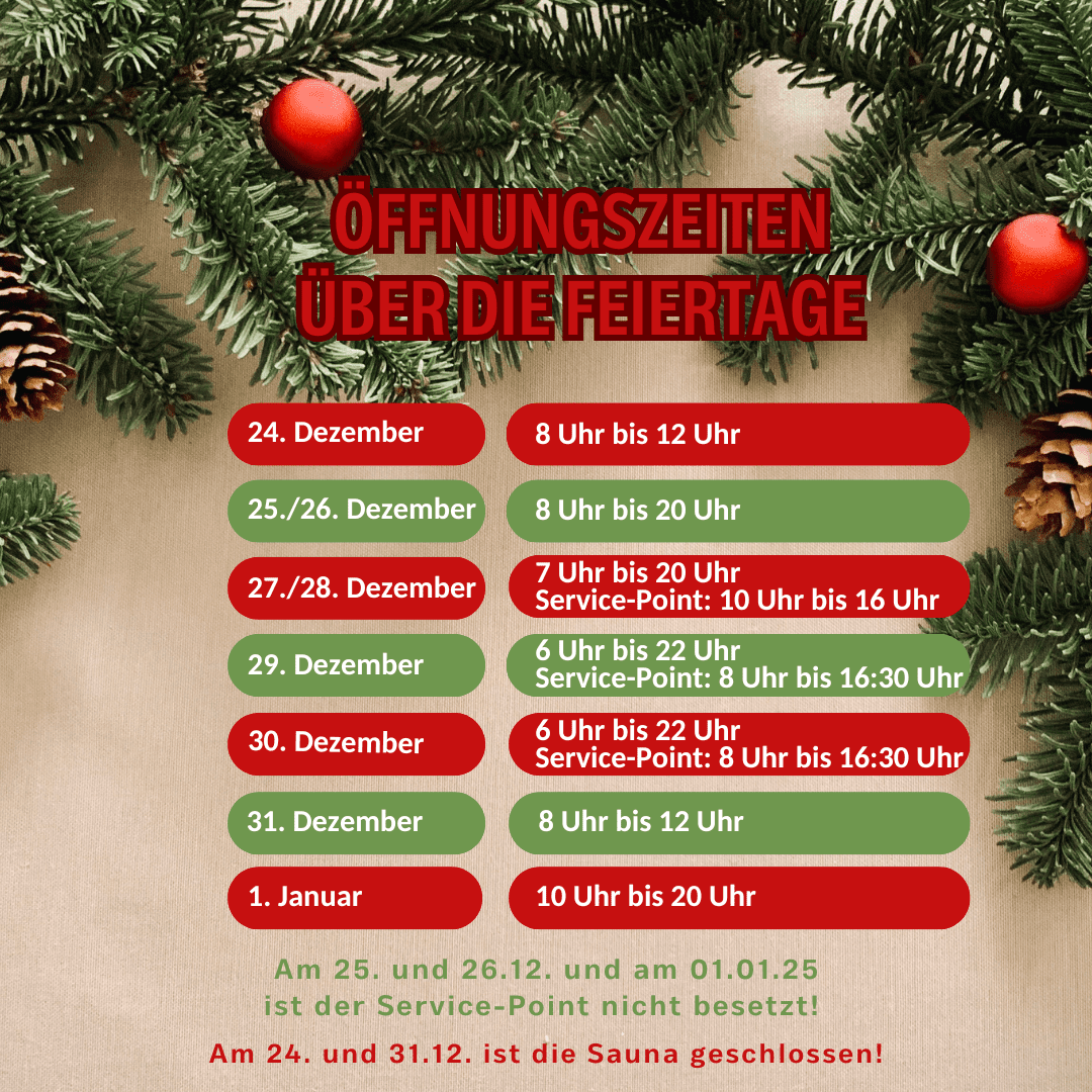 An den Weihnachtsfeiertagen sowie Silvester und Neujahr bitte die geänderten Öffnungszeiten der Schwimmhallen und Sauna beachten!