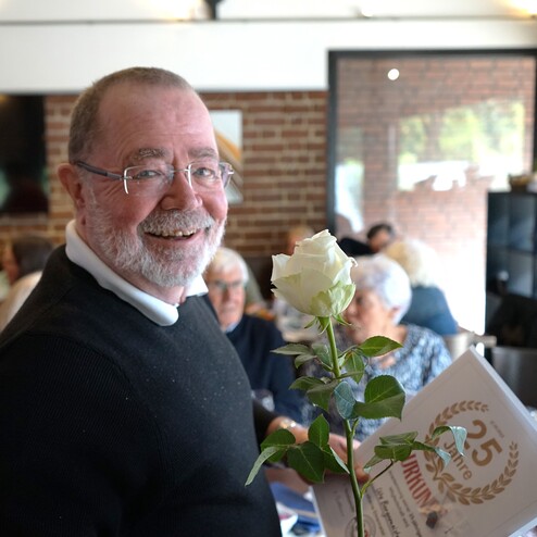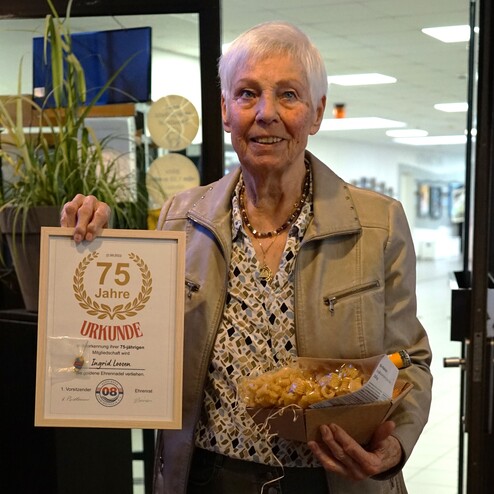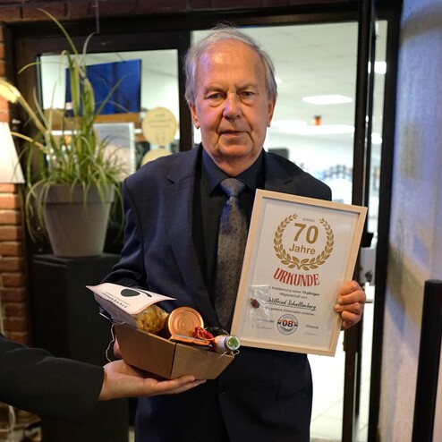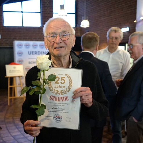 Im zweiten Teil des Vormittags standen die langjährigen Mitglieder im Mittelpunkt. Dr. Heinz Pudleiner ehrte auf der Bühne die Jubilare für ihre 40-, 50-, 65-, 70- und sogar 75-jährige Vereinstreue – angeführt von Ingrid Loosen, die dem Verein seit 75 Jahren die Treue hält, sowie Willfried Schallenberg mit 70 Jahren Mitgliedschaft beim USV 08. Danach folgte die persönliche Würdigung der 25-jährigen Jubilare direkt an den Tischen, die von Vorstand und Ehrenrat vorgenommen wurde.