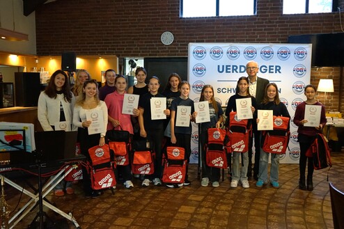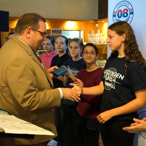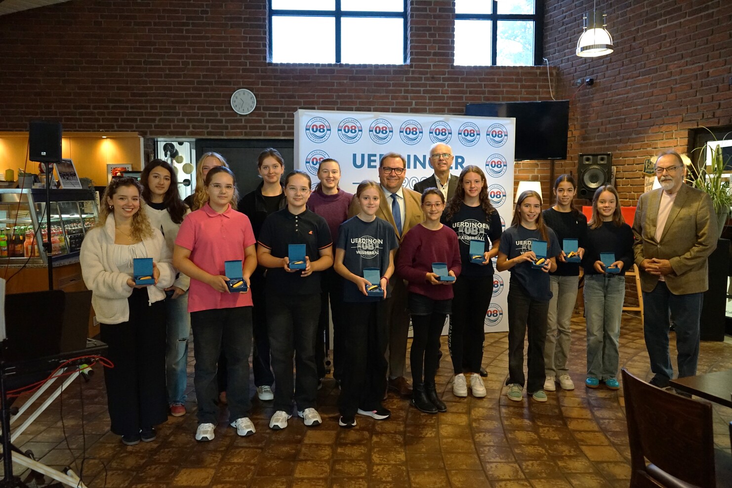 Gegen 10 Uhr trafen Oberbürgermeister Frank Meyer sowie Jochen Adrian vom Stadtsportbund Krefeld ein. Nach der Begrüßung durch unseren Vorsitzenden Dr. Heinz Pudleiner begann die Sportlerehrung durch den SSB. In seiner Ansprache würdigte OB Meyer die herausragenden Leistungen unserer Athletinnen: Geehrt wurden insbesondere die Wasserballerinnen der insgesamt vier Mannschaften – von der U14 bis zur Bundesliga. Ebenso wurden unsere erfolgreichen Schwimmerinnen Valentina Basile da Costa und Anna Hofmann ausgezeichnet. Alle freuten sich über ihre Medaillen des Stadtsportbunds, als auch über die Urkunden und Arena Rucksäcke vom Verein. Ein gemeinsames Pressefoto hielt diesen besonderen Moment fest.