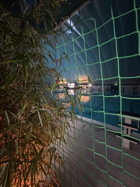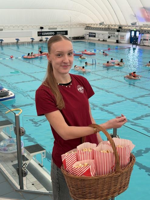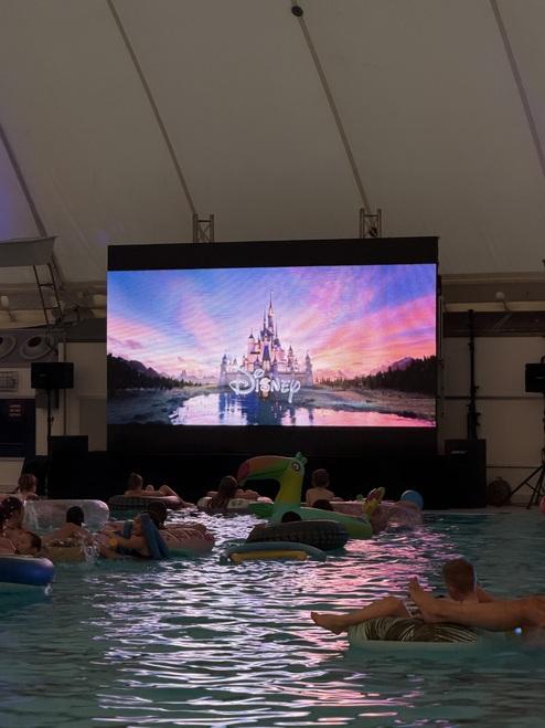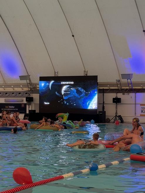 Bereits beim Betreten der Schwimmhalle wurde klar: Dieser Tag würde anders werden als ein gewöhnlicher Kinobesuch. Stimmungsvolle Lichtmodule tauchten das Becken in bunt schimmernde Farben, während auf dem Wasser Schwimmreifen und Schlauchboote sich ihren Weg bahnten – der perfekte Ort für einen gemütlichen Filmnachmittag im warmen Nass.