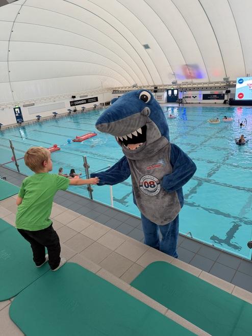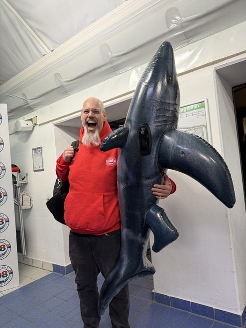 Besonderes Aufsehen erregte während des Abendfilms Schwimmlehrerin Anke, die mit einer auf dem Rücken befestigten Haiflosse eine kleine Erschreck-Runde drehte. Die Mischung aus Grusel und Spaß kam gut an. Und Breitensport-Coach Kai war passend zu seinem Wahl-Film „Der weiße Hai“ mit seinem aufblasbaren Hai unterwegs.