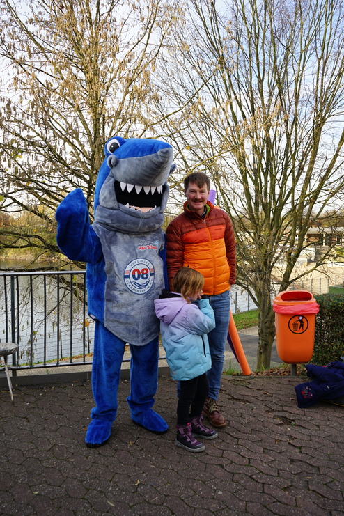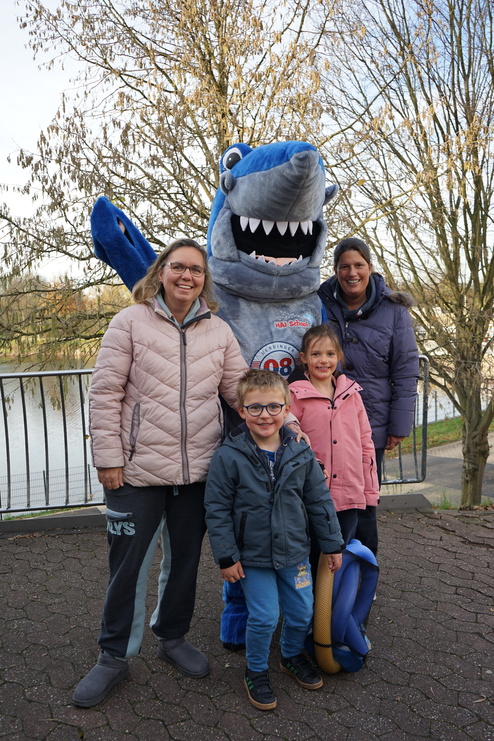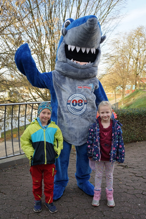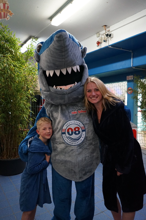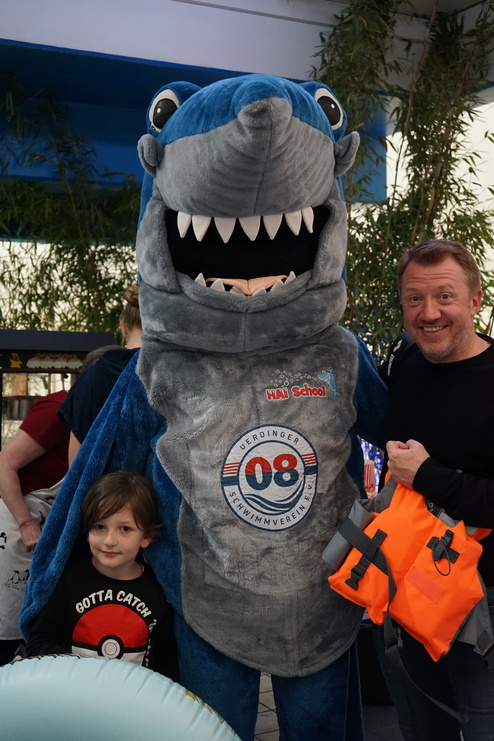 Besonderes Aufsehen erregte während des Abendfilms Schwimmlehrerin Anke, die mit einer auf dem Rücken befestigten Haiflosse eine kleine Erschreck-Runde drehte. Die Mischung aus Grusel und Spaß kam gut an. Und Breitensport-Coach Kai war passend zu seinem Wahl-Film „Der weiße Hai“ mit seinem aufblasbaren Hai unterwegs.
